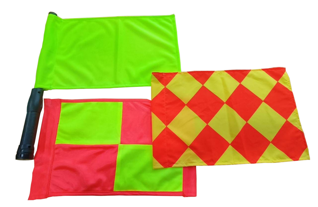 The flags themselves are illuminous yellow and orange checks and are attached securely onto the flag stick/shaft by a unique internal velcro design mechanism to allow you to easily remove them with a gentle ‘twist and wiggle’ to be able to wash them after every game, thus preserving their crispness and cleanliness, and also to stop them flying off or coming loose when signalling!